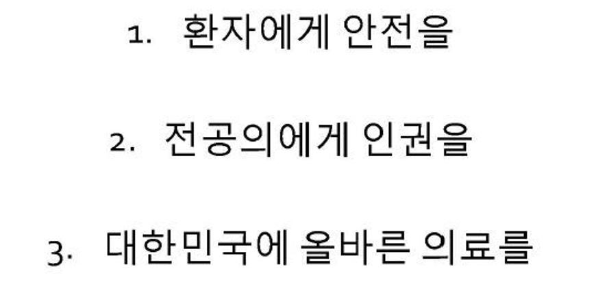 '환자에게 안전을' '전공의에게 인권을' '대한민국에 올바른 의료를'. 전공의협의회가 전공의특별법 제정에 목숨을 거는 세 가지 이유다.