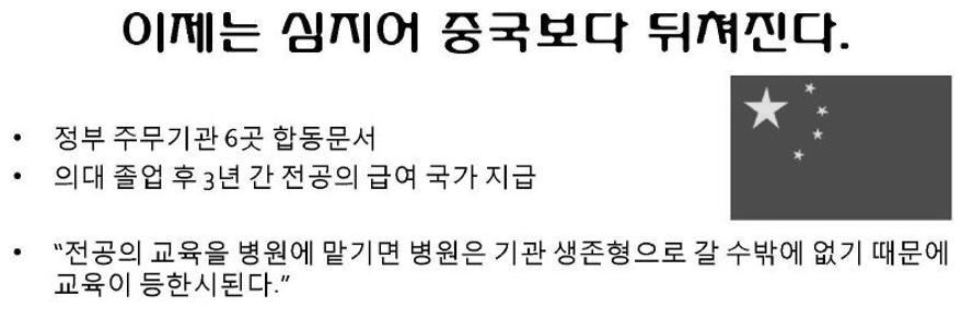 김 정책부회장은 "외과 전공의가 수련을 마치고도 맹장수술을 할 줄 모르고, 3년 반 동안 공부할 시간을 주지 않아 4년차 말에 자신이 독학해야 겨우 전문의자격 시험을 볼 수 있다"고 질타했다.