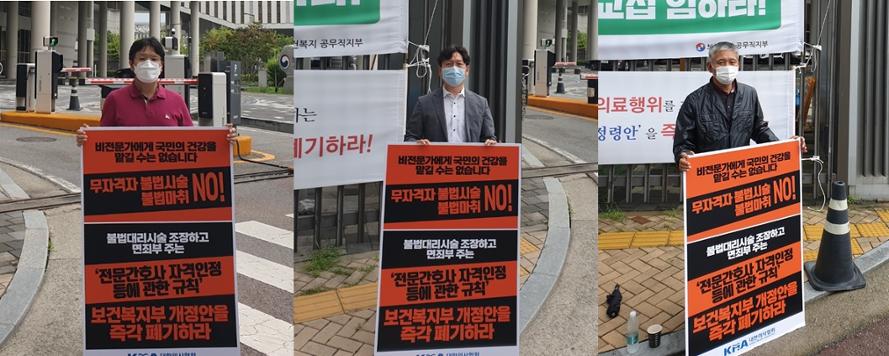 의협은 “이 개정안이 전문간호사의 업무범위를 더욱 확대하는 등 의사고유의 의료행위까지 침범할 수 있고, 처방을 통해 전문간호사가 독자적으로 의료행위를 할 수 있는 가능성을 열어두는 등 보건의료체계 근간을 흔드는 심각한 문제점이 있다”며, 1인 시위를 이어가고 있다.