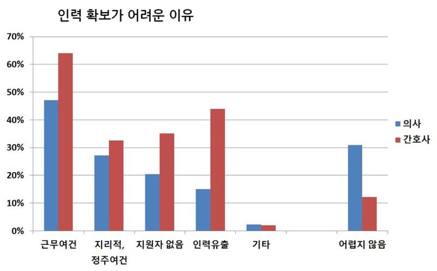 간호직 인력 확보의 장애 요인으로는 임금수준, 복지환경, 작업환경 등의 근무조건이 64.1%로 가장 높은 비율을 보였으며, 인력유출 44%), 지원자 없음이 35.1%, 지리적 및 정주 여건이 32.6% 등의 순이었다.