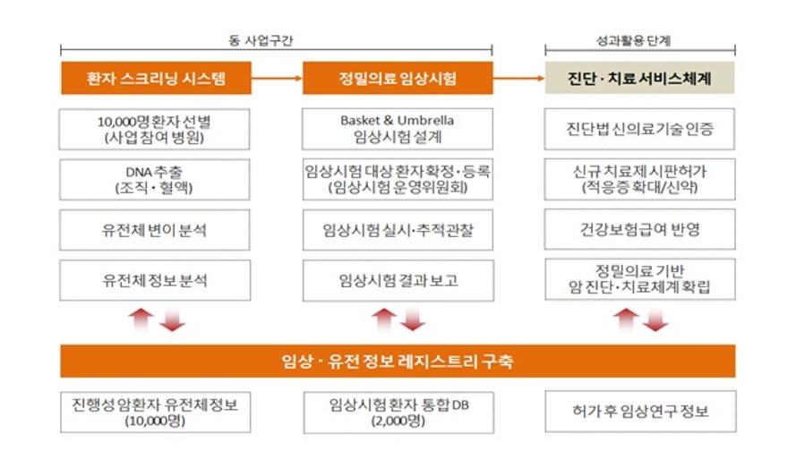 '암 정밀 진단치료법 개발 사업단'은 난치암 환자 유전변이에 맞춘 표적치료제 개발을 위해 국비 430억을 지원받는데, 난치암 환자 1만 명의 유전 정보를 분석해 그중 표적치료제 적용이 가능한 약 2천 명에게 개인맞춤 치료를 적용하고, 3건의 표적치료제 개발을 추진한다.