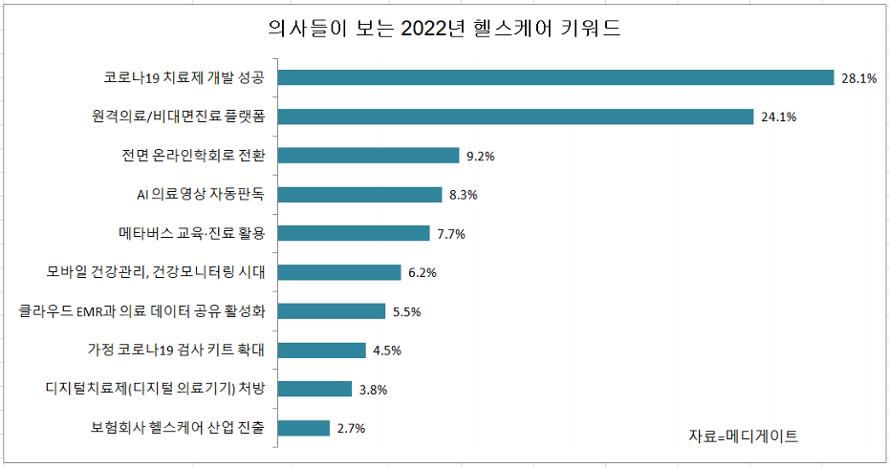 메디게이트 의사회원 1010명 설문조사 결과...헬스케어 키워드 1위 코로나19 치료제·2위 원격의료 플랫폼