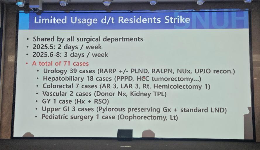 그러나 전공의 부재로 인한 인력 부족을 이유로 최근까지 로봇수술실 이용 자체가 제한적이었다. 전공의 집단사직이 마무리되지 않았던 올해 5월까지도 로봇수술실은 주2회만 사용됐고 6월부터 8월까지는 주3회 로봇수술이 실시됐다.