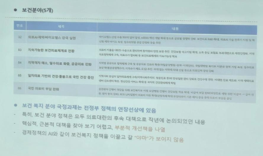 다만 현 정부의 전반적인 정책 기조는 전 정부인 윤석열 대통령과 크게 다르지 않아 '장기적 방향성이 부족하다'는 점은 비판적 요소로 꼽혔다. 이를 두고 김용익 이사장은 '정책의 야마(핵심 주제)가 부족하다'고 칭했다.