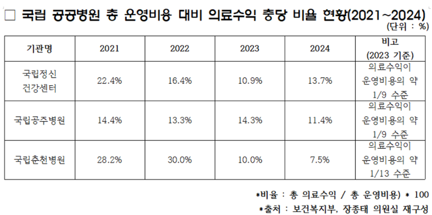국립정신건강센터의 경우 2023년 운영비용 대비 의료수익 충당 비율이 10.9%에 불과해 자체 수입만으로는 운영비의 9분의 1 수준밖에 충당하지 못하는 심각한 재정 상태를 보였다. 국립공주병원 역시 2024년 운영비용 대비 의료수익 충당 비율이 11.4%를 기록했다.