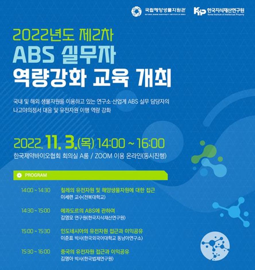 해외 해양유전자원 취득과 이용을 돕기 위해 준비한 이번 교육은 각 발표 주제에 대해 전문가가 강사로 참여하여 오후 2시부터 2시간 동안 진행할 예정이다.