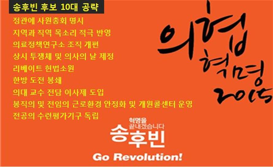 송 예비후보는 이날 회장에 당선되면 내부개혁, 대정부 투쟁, 의사회원의 자존심 회복 등 세 가지를 반드시 이루겠다고 약속하면서 10대 공약을 제시했다.