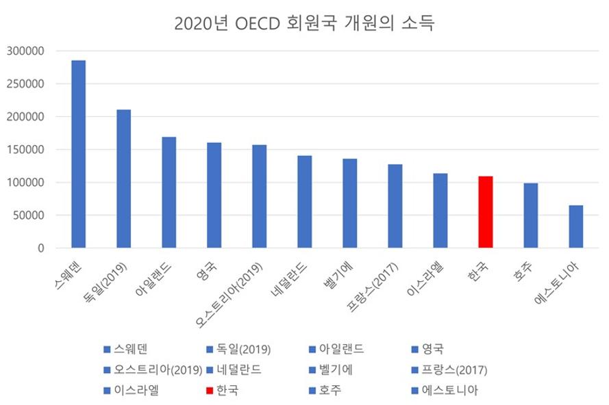 우리나라보다 봉직의 소득이 낮은 국가는 4만8509달러를 기록한 칠레, 4만2535달러인 코스타리카, 2만1341달러의 멕시코 등이었다.