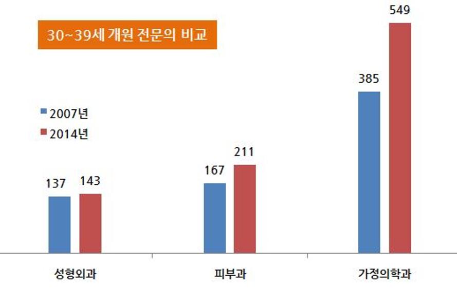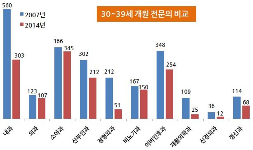비교 분석한 결과 2014년 개원한 30~39세 전문의 수가 2007년에 비해 크게 감소했다.