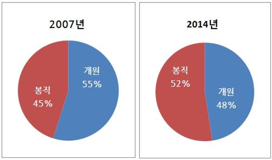 2007년의 경우 개원의가 45.7%, 봉직의가 37.6%였지만 2014년에는 개원의가 42%로 줄어든 반면 봉직의가 46.3%로 10% 가까이 늘어난 것으로 나타났다.