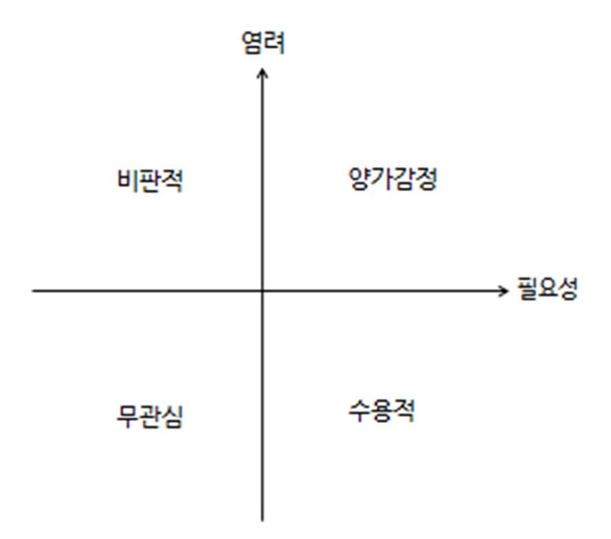 [그림 1] 약물에 대한 환자의 태도와 믿음을 도식화한 표. x축은 환자가 느끼는 약물의 필요성, y축은 약물에 대한 염려 수준을 나타냄. (출처: 분당서울대병원 제공)