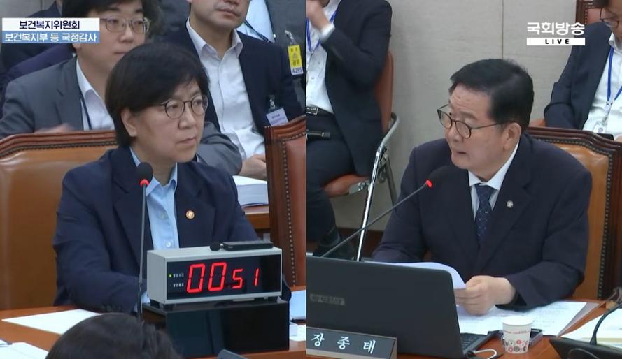 사진 왼쪽부터 보건복지부 정은경 장관, 더불어민주당 장종태 의원 모습. 사진=국회방송