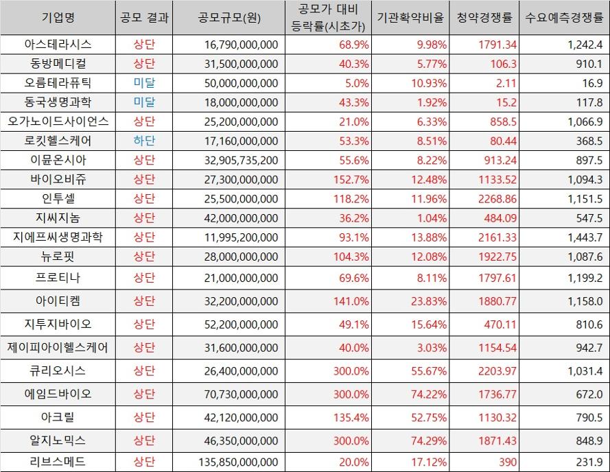 기관 수요예측 경쟁률 측면에서는 지에프씨생명과학이 1443.7:1로 가장 높았다. 이 외에도 아스테라시스, 프로티나, 아이티켐, 인투셀, 바이오비쥬, 뉴로핏, 오가노이드사이언스, 큐리오시스 등이 기관 경쟁률 1000대 1 이상을 기록했다.