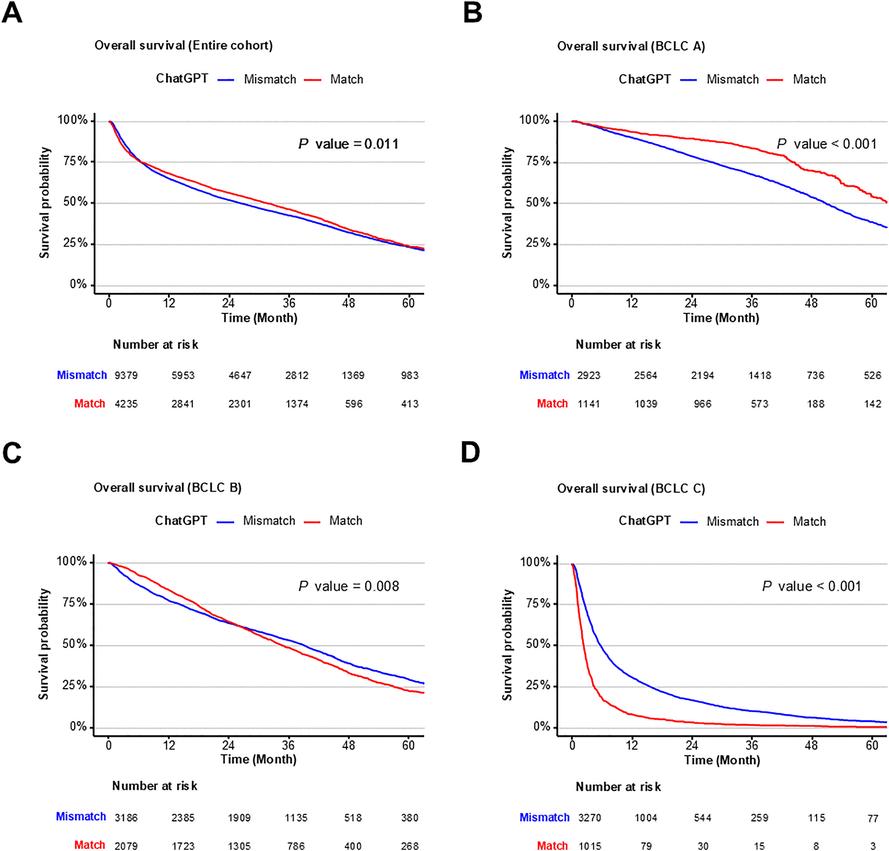 분석 결과 AI 권고와 실제 치료의 일치율은 27~33%로 나타났다. 병기별 하위분석에서는 일부 병기에서 AI 권고와 일치한 치료를 받은 환자군의 생존 차이가 관찰된 반면, 진행성 간암에선 오히려 일치군의 생존이 낮은 경향이 확인됐다.