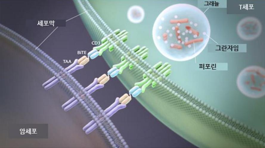 때문에 블린사이토를 통해 우리 몸의 T세포와 백혈병 세포가 서로 가까워지고, 백혈병 세포와 인접한 T세포가 독성을 나타내 백혈병 세포를 사멸하는 것이다.