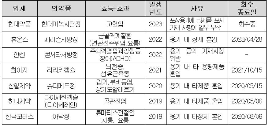 표 = 2019년도부터 2023년 6월까지 의약품 제품혼입사고(소비자주권시민회의 제공)