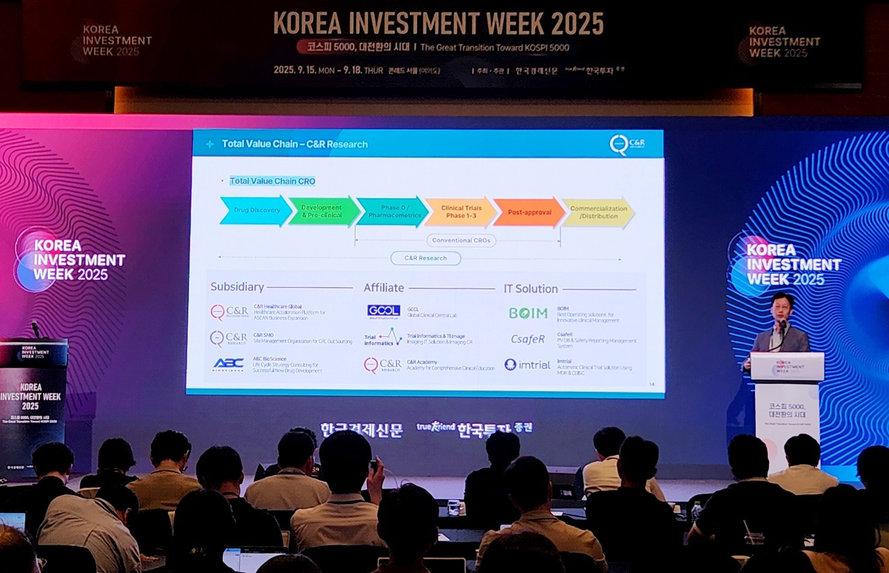 임상시험수탁기관(CRO) 씨엔알리서치는 지난 16일 국내 최대 규모의 IR 행사인 ‘코리아 인베스트먼트 위크(KIW) 2025’에 참석, ‘임상시험 효율 극대화 전략’을 주제로 발표를 진행했다고 밝혔다.