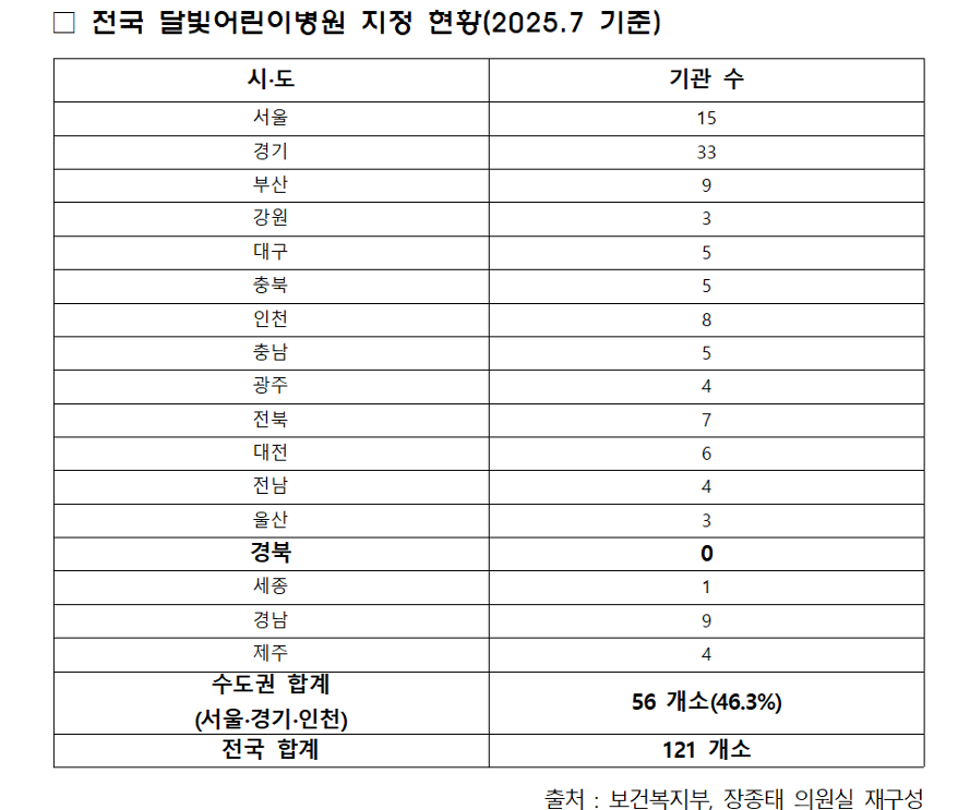 4일 국회 보건복지위원회 장종태 의원(더불어민주당, 대전 서구갑)이 보건복지부로부터 제출받은 자료를 분석한 결과, 현재 달빛어린이병원의 가장 심각한 문제는 지역별 불균형으로 나타났다. 전체 121개소 중 서울, 경기, 인천 등 수도권에만 절반에 가까운 46.3%(56개소)가 집중된 반면, 경상북도는 올해 7월까지 단 한 곳도 지정되지 않다가 최근에서야 4개소가 지정됐다.