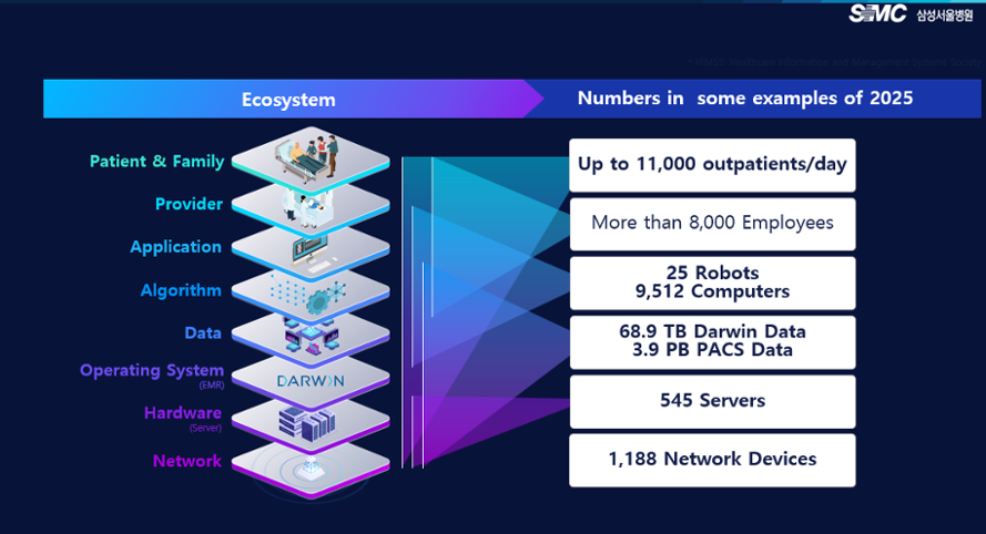 삼성서울병원은 하루 환자 1만1000여명, 직원 수 8000명, 컴퓨터 9512대, 로봇 25대, 서버 545개, 네트워크 기기 1188대 등 복잡한 시스템으로 연결돼 있다.
