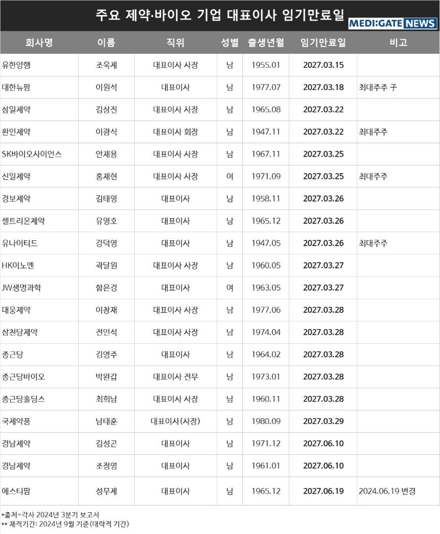 [메디게이트뉴스 이지원 기자] 주요 제약·바이오 기업의 대표이사 임기 만료일을 살펴본 결과 10명 중 3.4명이 연임 혹은 교체를 앞두고 있는 것으로 나타났다.