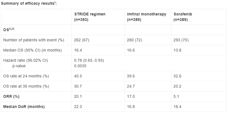 3~4등급 치료 관련 간 사건 발생률은 치료군 전체에서 낮았다(STRIDE 요법군 5.9%, 임핀지군 5.2%, 소라페닙군 4.5%). 치료 관련 부작용으로 STRIDE 요법군 8.2%, 임핀지군 4.1%에서 치료를 중단한 반면, 소라페닙군에서는 11%가 중단했다.
