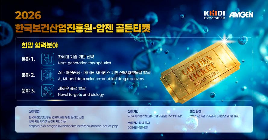 암젠코리아가 한국보건산업진흥원과 함께 국내 바이오·헬스케어 생태계 활성화를 위해 ‘2026 한국보건산업진흥원–암젠 골든티켓(Amgen Golden Ticket)’ 프로그램 참가 기업 모집을 시작한다고 12일 밝혔다.
