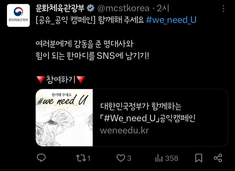 이에 더해 문체부는 심지어 의사들이 현장으로 돌아오라는 위니드유('#We need u) 공익캠페인까지 진행 중이다. 문체부는 SNS 계정을 통해 '우리 곁으로 돌아와주세요'라는 영상을 게재하고 '여러분에게 감동을 준 명대사와 힘이 되는 한마디를 SNS에 해시태그와 함께 남겨달라'고 전했다. 해당 영상엔 '자신의 삶보다는 우리의 생을 위해'라는 문구가 담겼다.
