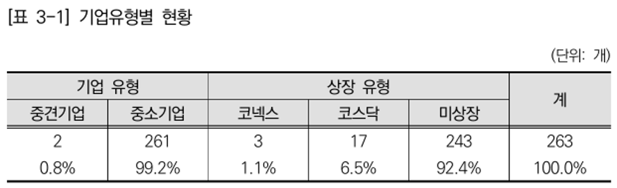 업종별로는 절반가량이 연구개발업(M70), 그중에서도 의학·약학 연구개발업에 집중됐다. 약 3분의 1은 응용 소프트웨어 개발·공급업과 의료기기 제조업에 속했다.