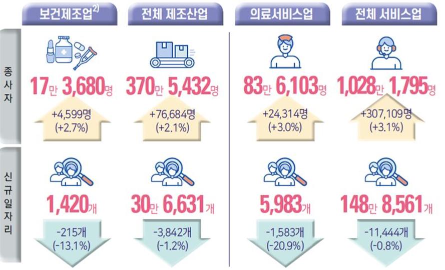분야별로는 의료기기 종사자 수 증가율이 5.9%로 전년동기 대비 가장 높게 나타났으며, 다음으로 의료서비스(+3.0%), 제약·화장품(각각 +1.2%) 순이었다.
