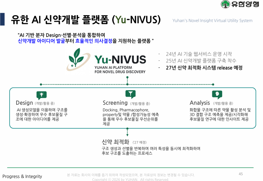 또한 유한양행은 AI 신약개발 고도화를 위해 AI 플랫폼 '유-니버스(Yu-NIVUS)'를 2027년 1분기까지 구축한다. 회사는 유-니버스를 통해 후보물질 설계·선별·분석을 통합하는 데이터 기반 연구 체계를 구축한다.