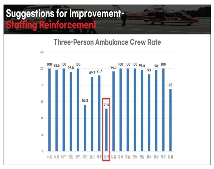 최 구급대원은 "이천과 여주, 양평 지역의 구급차 절반 이상이 2인으로 운영되고 있다. 이런 인력 구조에서는 평가·처치·이송을 동시에 진행하기 어렵다"고 지적했다.