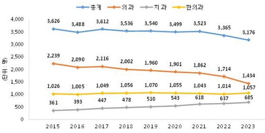 분야별로는 의과가 279명 감소했고, 치과 및 한의과는 각각 48명, 47명이 증가했다.