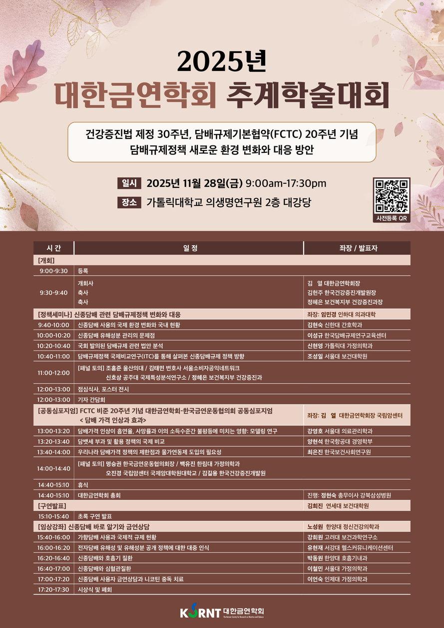대한금연학회는 오는 28일 오전 9시~오후 5시30분 가톨릭대학교 의생명연구원 2층 대강당에서 약 200명이 참석한 가운데 ‘2025년 추계학술대회’를 개최한다고 24일 밝혔다.