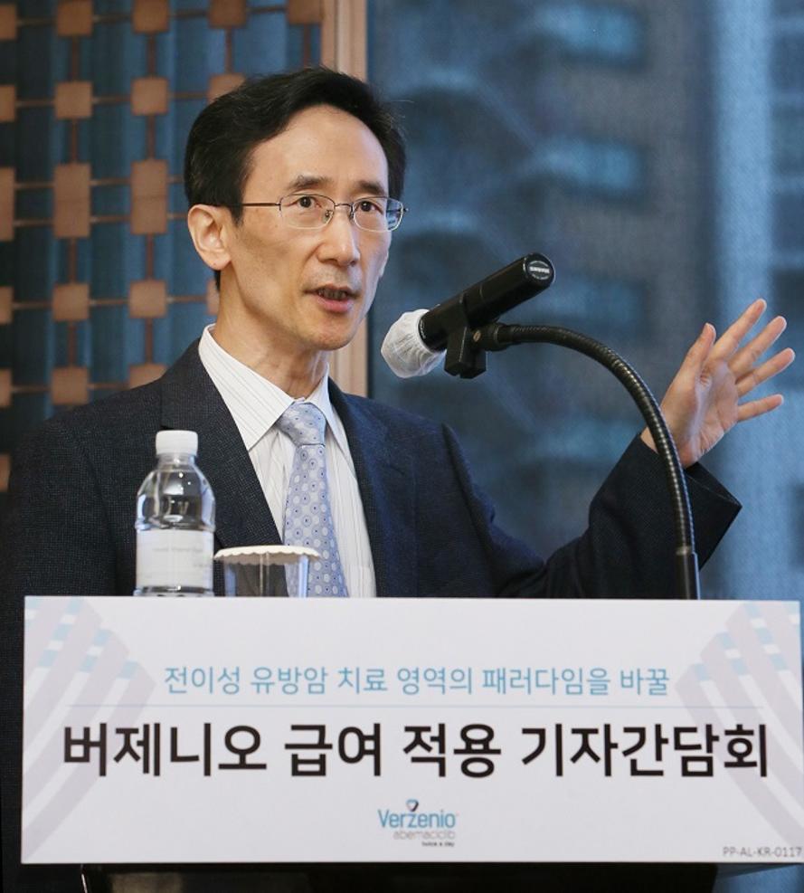 이날 간담회에서 국립암센터 유방암센터장인 혈액종양내과 이근석 교수는 진행성 및 전이성 유방암 치료에서의 미충족수요와 버제니오의 허가 임상시험인 MONARCH 2, 3 결과를 소개했다.