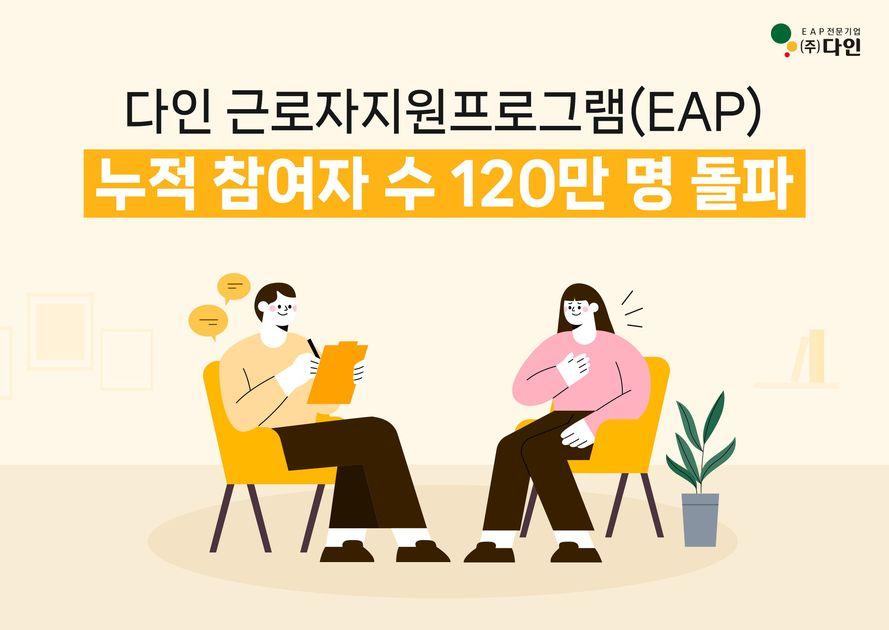 다인 송민경 대표는 "다인의 누적된 데이터와 전문성을 바탕으로 고객사의 신뢰를 얻은 덕분에 참여자 120만 명 돌파라는 유의미한 성과를 낼 수 있었다"며 "앞으로도 직장인들의 든든한 힐링파트너로서 개인과 기업 모두에게 도움이 되는 통합 EAP 서비스를 제공하기 위해 지속적으로 노력하겠다"고 말했다.