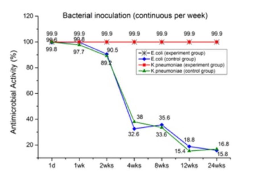 은을 코팅하는 방식이 아니라 스텐트 겉에 덧씌워진 실리콘 폴리머에 은 입자를 고정시키는 신기술은, 은 입자가 담즙에 씻겨 나갈 가능성을 원천적으로 차단해 안전성을 높이면서도 바이오필름 형성 억제 및 항염증 효과를 지속시켰다. [그림1] 은 입자 고정 기술을 활용한 담도 스텐트(test group)는 항균 효과가 지속적으로