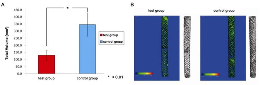 종합한 수치가 8점인 반면, 기존 스텐트(control group)의 경우 11점으로 나타나 새 스텐트로 인해 염증 등의 수치가