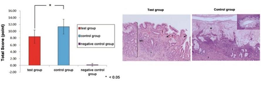기존 스텐트(control group)의 경우 345.90㎣로 나타나 협착률이 63% 감소함.[그림3] 은 입자 고정 기술을 활용한 담도 스텐트 시술환자군(test group)은 담관 부위의 염증, 괴사, 섬유화 정도를