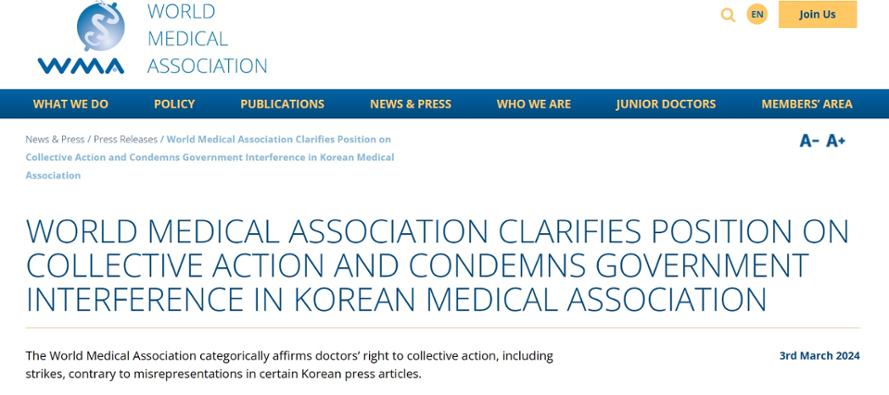 세계의사회는 "특정 한국 언론의 허위 보도기사와 달리 파업을 포함한 의사들의 단체 행동권을 단호히 인정하고 있다"라며 "의사들의 단체 행동의 윤리적 의미에 관한 세계의사회 성명은 그런 행동의 적절한 실행에 대한 명확한 지침을 제시하고 있다"고 밝혔다.