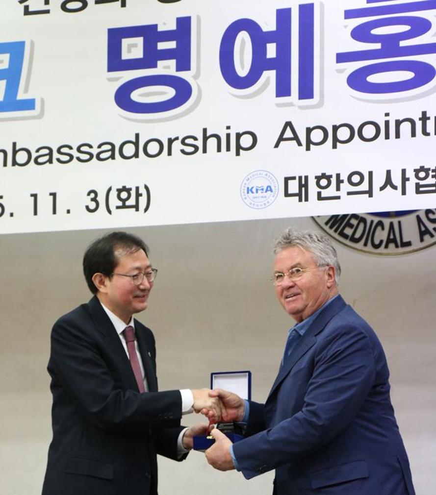 3일 대한의사협회는 대한민국 축구팀의 월드컵 4강 신화를 이뤄낸 거스 히딩크 전 감독을 명예홍보대사로 위촉했다.
