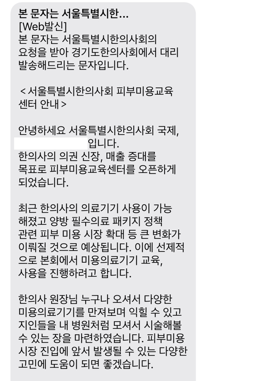 서울시한의사회는 안내 문자를 통해 "최근 한의사의 의료기기 사용이 가능해졌고 양방 필수의료 패키지 정책 관련 피부미용 시장 확대 등 큰 변화가 이뤄질 것으로 예상된다"며 "이에 선제적으로 미용의료기기 교육을 진행하려고 한다"고 밝혔다.