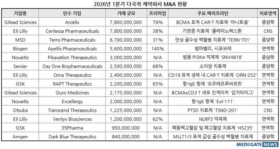 [메디게이트뉴스 박도영 기자] 2026년 1분기 일라이 릴리(Eli Lilly and Company)가 3건 인수를 단행했고, 노바티스(Novartis)와 GSK, 길리어드 사이언스(Gilead Science)도 2건 거래를 진행하는 등 빅파마들의 인수합병(M&A)이 활발하게 이뤄졌다. 최근 몇 년간 활동이 뜸했던 바이오젠(Biogen) 역시 거금을 투자해 상업화 단계 바이오텍을 인수하면서 단기 및 장기 성장 전망을 강화했다.