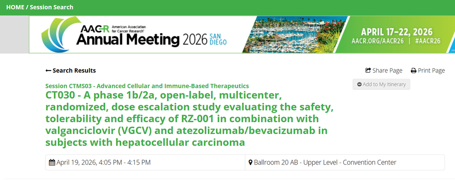 초록의 제목은 'A phase 1b/2a open-label, multicentre study of an hTERT-targeted RNA replacement gene therapy in combination with valganciclovir and anti-VEGF/PD-L1 antibodies in patients with hTERT-positive hepatocellular carcinoma'로, ‘hTERT 양성 간세포암 환자를 대상으로 hTERT 표적 RNA 치환 유전자 치료와 발간시클로버 및 항 VEGF/PD-L1 항체 병용요법의 효과를 평가하는 제1b/2a상, 공개, 다기관 임상 연구’에 해당한다.