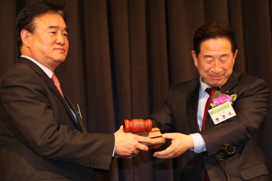 변영우 전 의장(오른쪽)이 이날 선출된 임수흠 신임 의장에게 의사봉을 전달하고 있다
