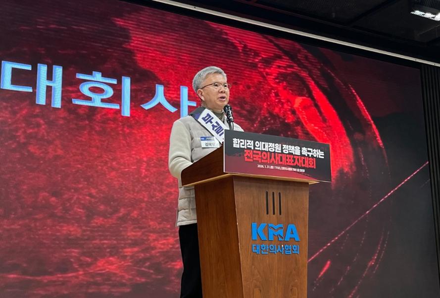 김택우 회장은 이날 오후 5시 의협회관 지하 강당에서 진행된 '전국의사대표자대회'에서 "지금 대한민국의 의학교육은 생존의 기로에 서 있다. 정부는 2027학년도 의대 정원 확정을 위해 무리하게 시간에 쫓기며 또다시 ‘숫자놀음’을 반복하려 하고 있다. 하지만 의학교육은 단순히 강의실에 학생을 채우는 것으로 완성되지 않는다"고 말했다.
