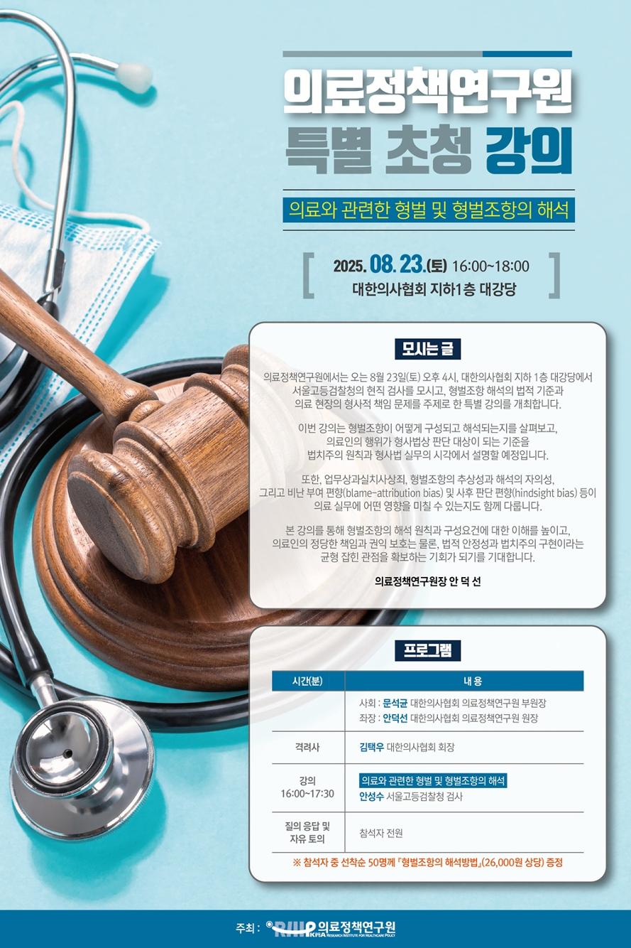 [메디게이트뉴스 하경대 기자] 의료정책연구원이 오는 8월 23일 오후 4시 의협회관 지하 1층 대강당에서 ‘의료와 관련한 형벌 및 형벌조항의 해석’을 주제로 서울고등검찰청 검사 초청 특별 강의를 개최한다. 강연자는 서울고등검찰청 안성수 검사가 맡는다.