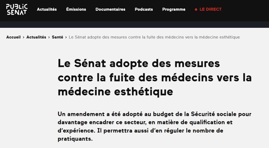 '프랑스 상원은 의사들이 미용의료로 이탈하는 것을 막는 조치를 채택했다'는 제목의 퓌블릭세나 보도.