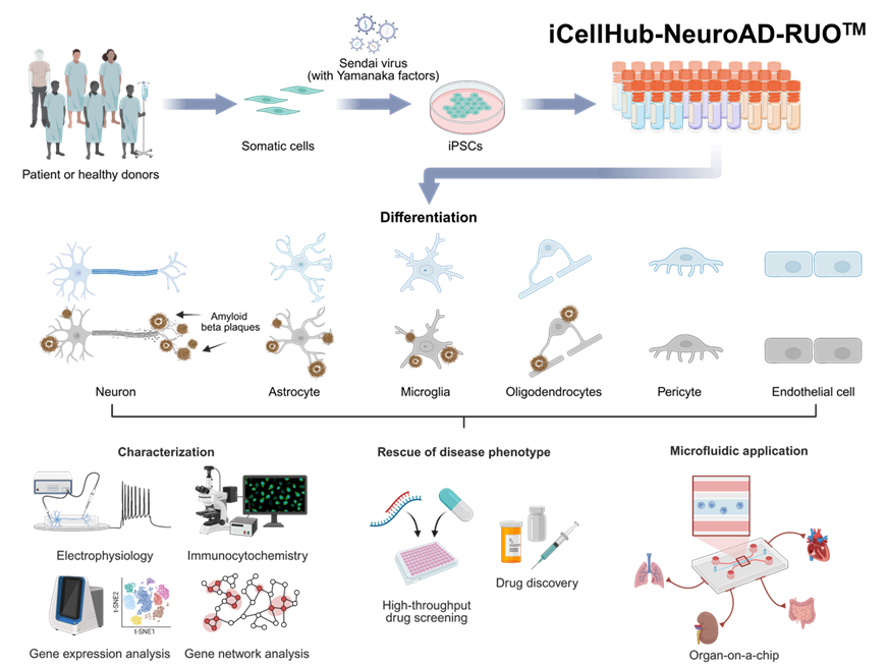 iPSC의 강점인 무한 증식과 다양한 세포로의 분화 능력도 활용성을 확대한다. iCellHub‑NeuroAD‑RUO 세포주는 연구 목적에 따라 뉴런(Neuron), 성상교세포(Astrocyte), 미세아교세포(Microglia), 희소돌기아교세포(Oligodendrocyte) 등 다양한 뇌 세포로 분화가 가능하며, 분화된 세포 모델은 아밀로이드 베타 플라크 형성 확인 등 병리 분석뿐 아니라 고효율 약물 스크리닝, 장기 칩(Organ-on-a-chip) 기술 등에 폭넓게 활용될 수 있다.