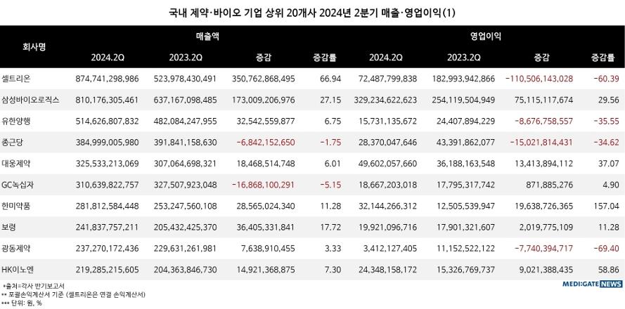 이들 중 1000억원대 매출을 달성한 기업은 20개사로 ▲셀트리온 ▲삼성바이오로직스 ▲유한양행 ▲종근당 ▲대웅제약 ▲녹십자 ▲한미약품 ▲보령 ▲광동제약 ▲HK이노엔 ▲동국제약 ▲제일약품 ▲JW중외제약 ▲동아에스티 ▲일동제약 ▲휴온스 ▲한독 ▲콜마비앤에이치 ▲대원제약 ▲셀트리온제약 등이다. 이 중 매출과 영업이익이 모두 증가한 기업은 단 6곳으로, 삼성바이오로직스, 대웅제약, 한미약품, 보령, HK이노엔, 동국제약이다.