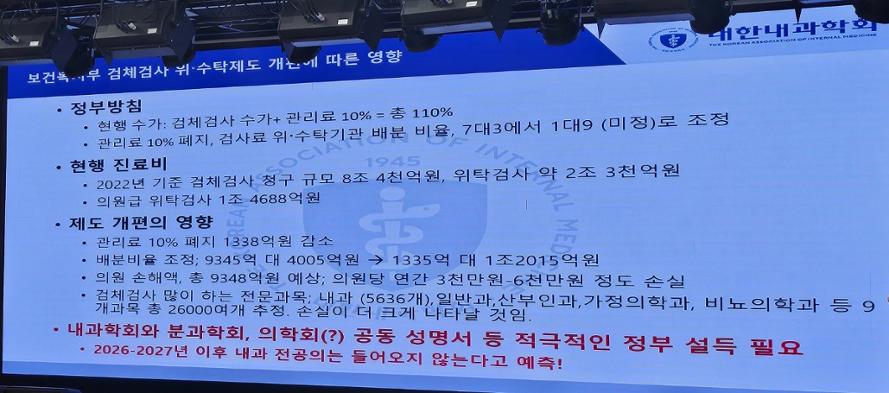 그는 "검체검사를 가장 많이 하는 과는 내과로 이번 검체검사 제도 개편으로 가장 큰 피해를 보게 된다. 아마 제도 개편이 확정될 경우 내과는 아무도 안 하려고 하는 과가 될 것"이라며 "당장 내년은 영향을 안 받을 수도 있겠지만 2027년 전공의 모집은 완전히 썰렁한 상황이 벌어질 것으로 예상된다"고 지적했다.